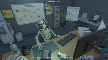 Depiction of a indie game dev, namely me, waiting for Synty studios to convert their Polygon assets, complete with;